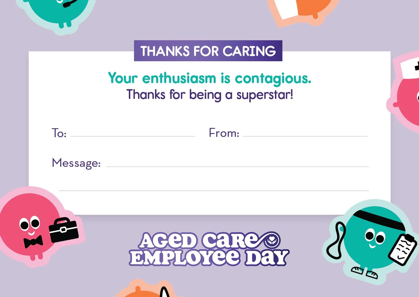 This internal project for Ryman Healthcare was created to celebrate team members on Aged Care Employee Day, by sharing appreciation messages from residents to staff. The deliverables included a wordmark, a wall banner for displaying messages of gratitude, appreciation cards for residents to write on, and stickers.